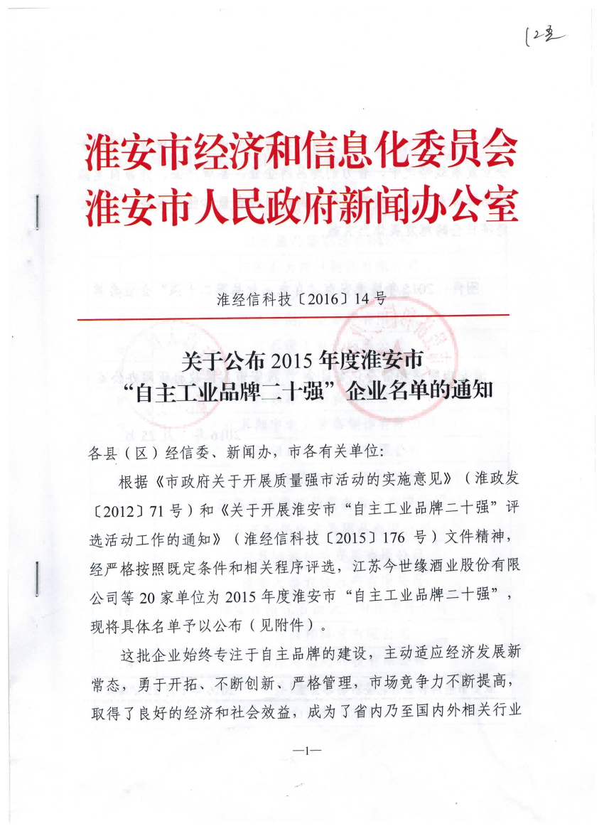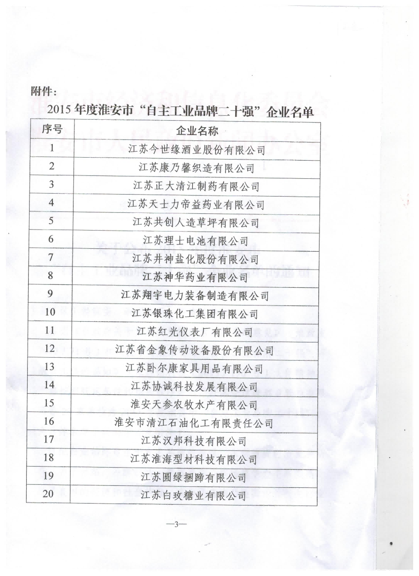 根據(jù)市政府評選,我公司被認定為淮安市“自主品牌二十強”企業(yè)?!白灾髌放贫畯娖髽I(yè)”是我市在國內(nèi)相關行業(yè)具有代表性并且競爭力較強的企業(yè),我公司名列第11名。
